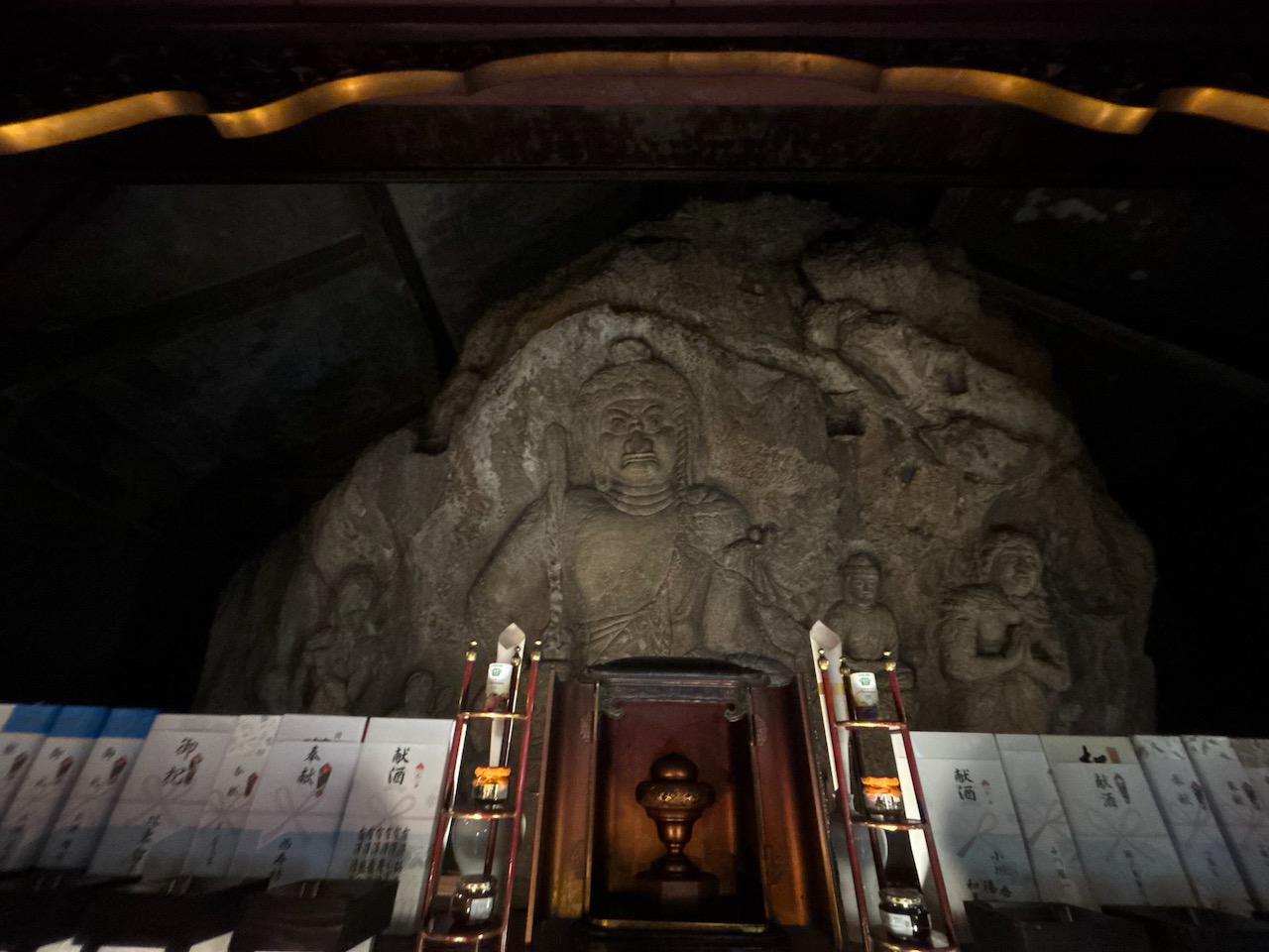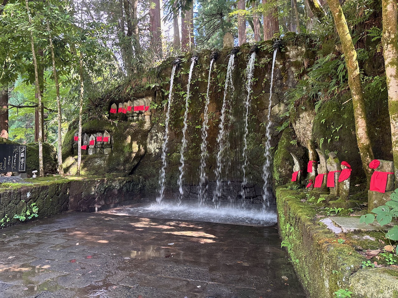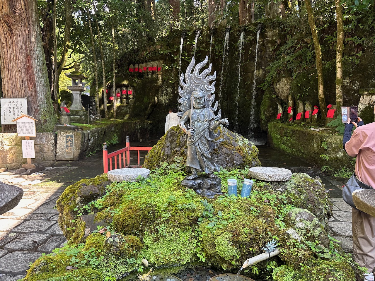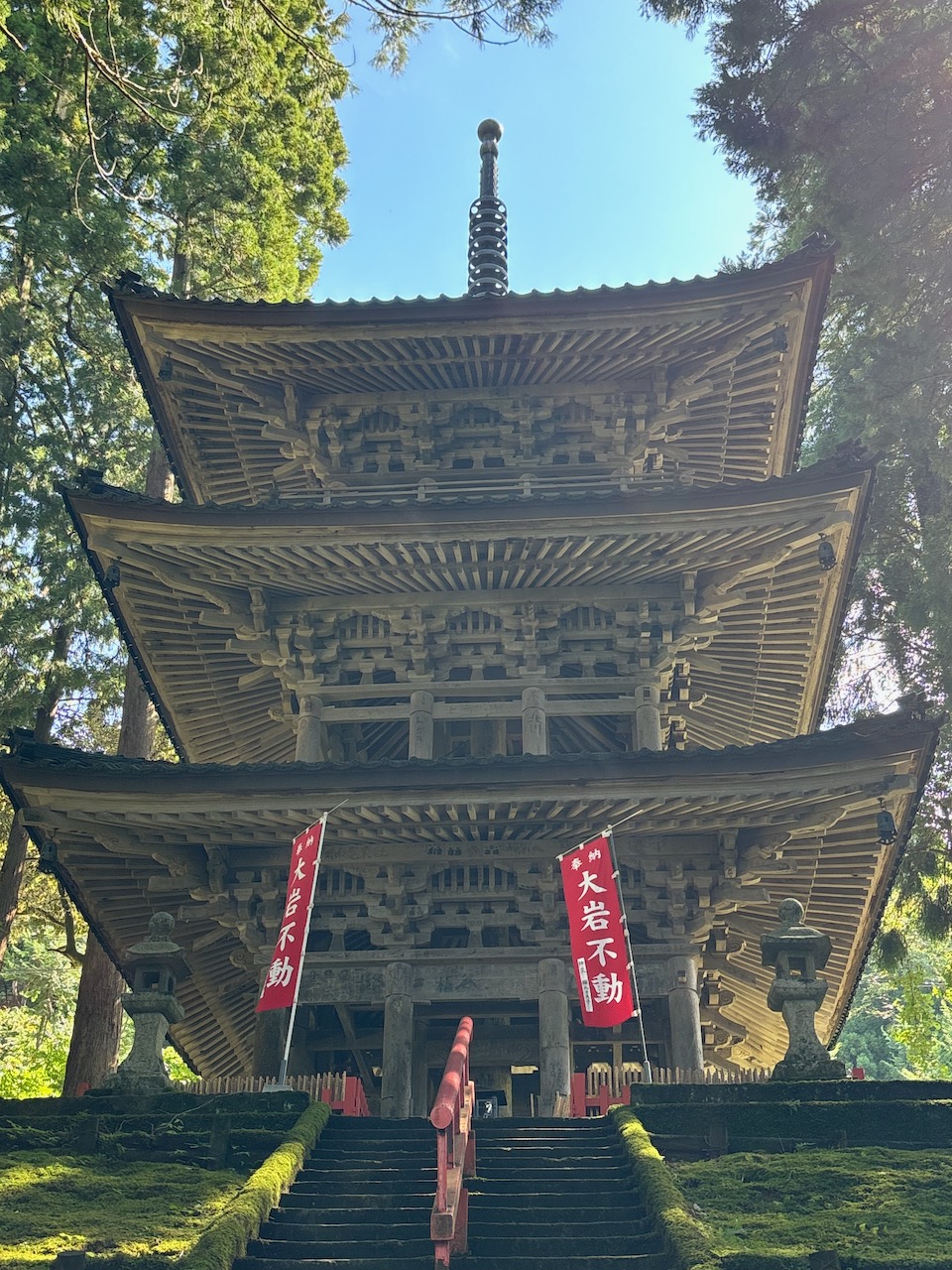 弓の里歴史文化会館を出て大岩さんにむかいました。いつものように上の方の駐車場に車を停め、本堂に入る前に三重塔までの階段を登りました。さすがに平日なので参拝客はまばらでしたが、三人の若い女性達が白装束を着て六本滝で滝行体験をやっていました。滝の水が冷たいのか痛いのかわかりませんが、少し当たっただけで終わっていたようです。