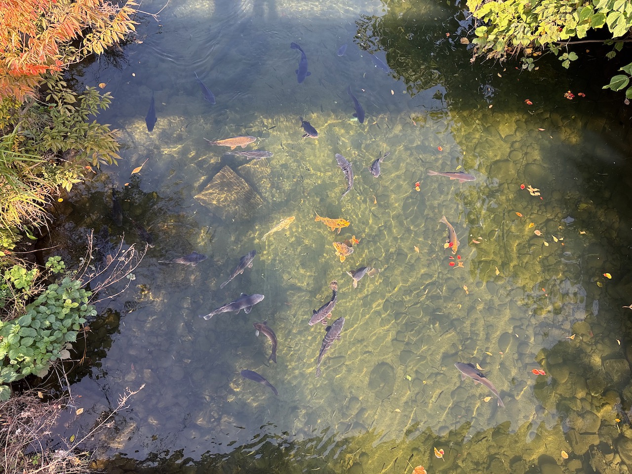 天気もいいので歯固めの石を返しに護国神社へ。七五三やお宮参りの人たちが何組も来ていたようです。磯部堤も散歩しましたが、橋を渡る時に水音がしたので水面を見てみると鯉がたくさん集まっていました。普段から誰かがその橋の上から餌を与えていたらしく、橋の上を人が歩く気配がしたら鯉たちが集まってくるようです。神社前から続くイチョウ並木が良い感じに色付くにはまだちょっと早かった感じです。