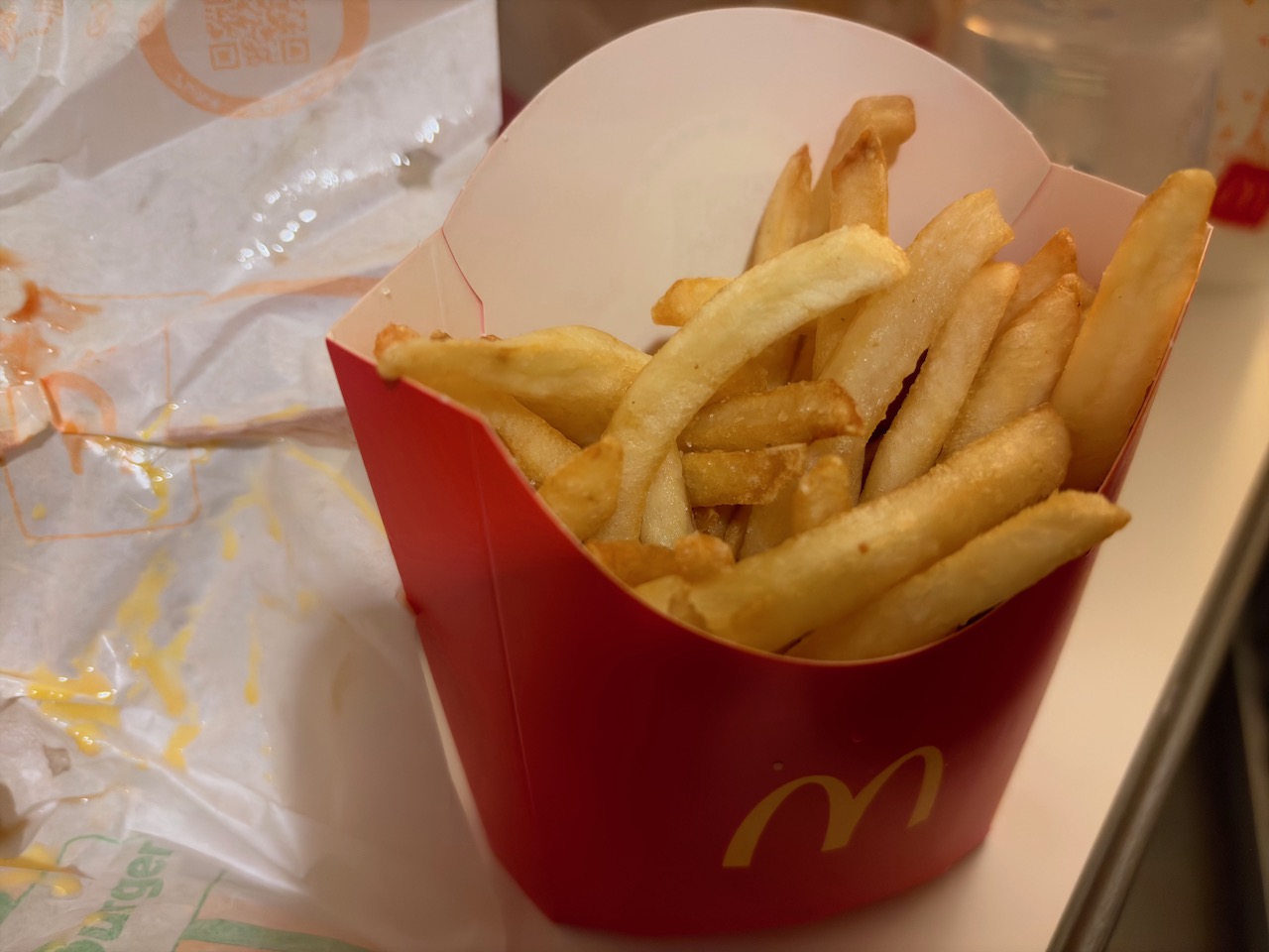 食べ物&飲み物 マクドナルド 2025 / 11 / 22 NK コメントする 晩ご飯はマクドナルドのテイクアウトで。最初は最安のハンバーガーセットにしようかと思っていましたが、さすがにそれだと寂しいのでエグチ(エッグチーズバーガー) セットにして、かみさんはポテトをナゲットに変更。 エッグチーズバーガー マックフライポテト 関連