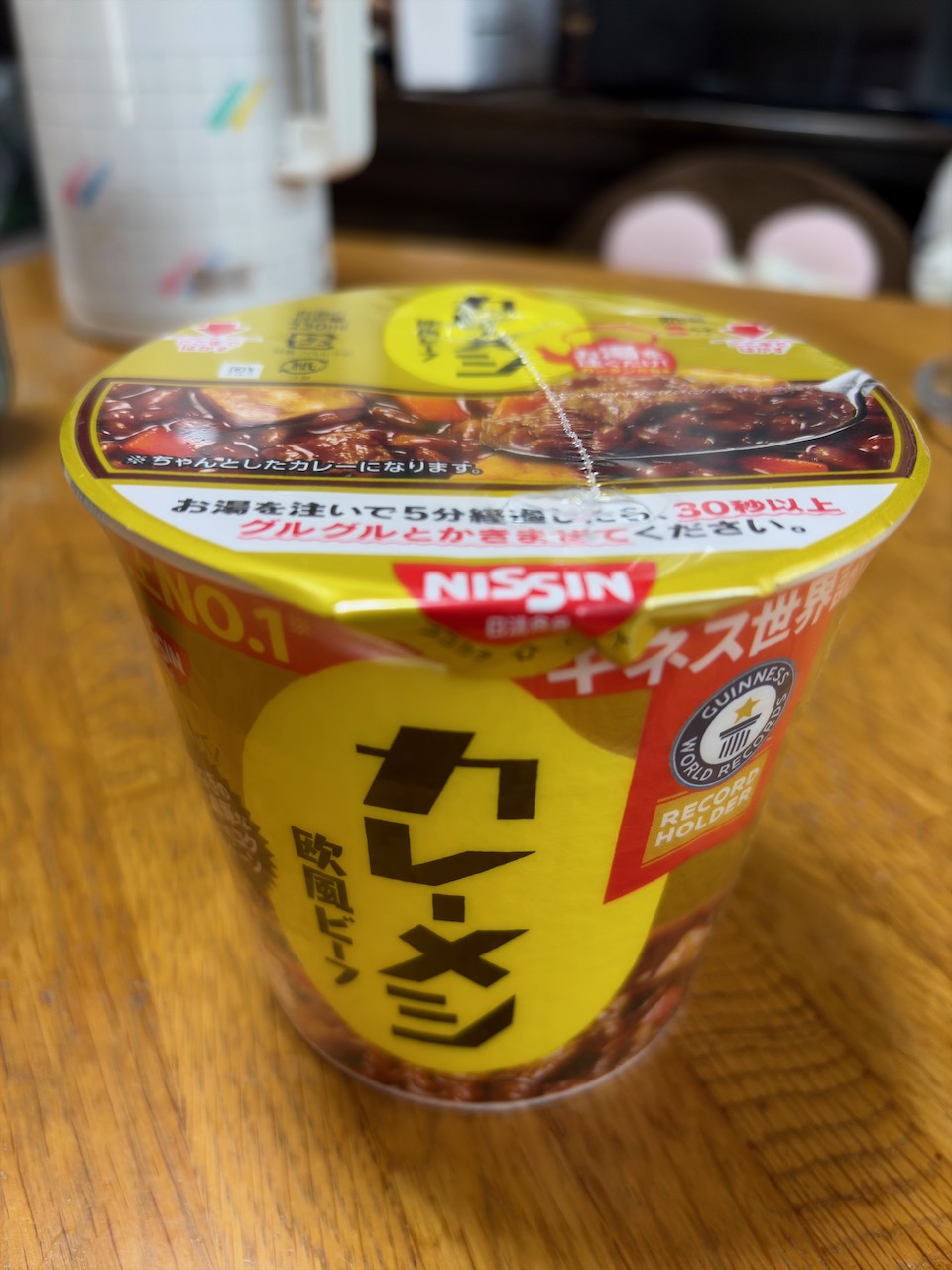 かみさんは娘1号とランチなので、お昼は日清カレーメシ 欧風ビーフ。セブンイレブンの100円引きアプリクーポンでこれと完全メシ カレーメシ 欧風カレーがあったのですが、完全メシの方が100円高かったのでこれにしました。初めて食べるので普通のカップラーメンのつもりでお湯を注いでいたらお湯を入れる目安の線が見えません。どうもお湯を多く入れ過ぎてしまったようです。実際に食べてみたらそれほどお湯の量の影響はなさそうで、それなりに美味しくいただけました。